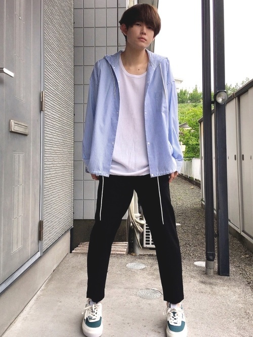 ストライプシャツとアンクル丈のパンツで爽やかさ満点のメンズコーデです。スポーツシューズの要素が取り入れられたスニーカーは、レザーとメッシュの合わせ技でスポーティになりすぎずレトロな雰囲気にしてくれます。