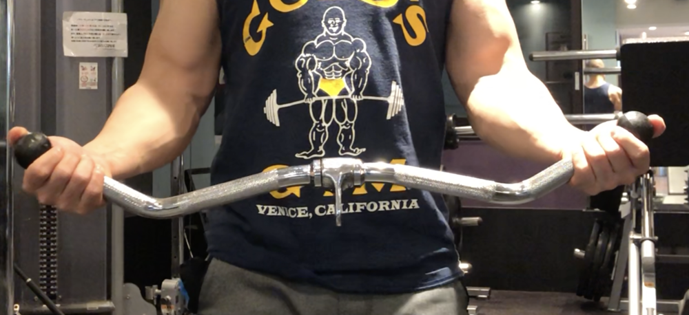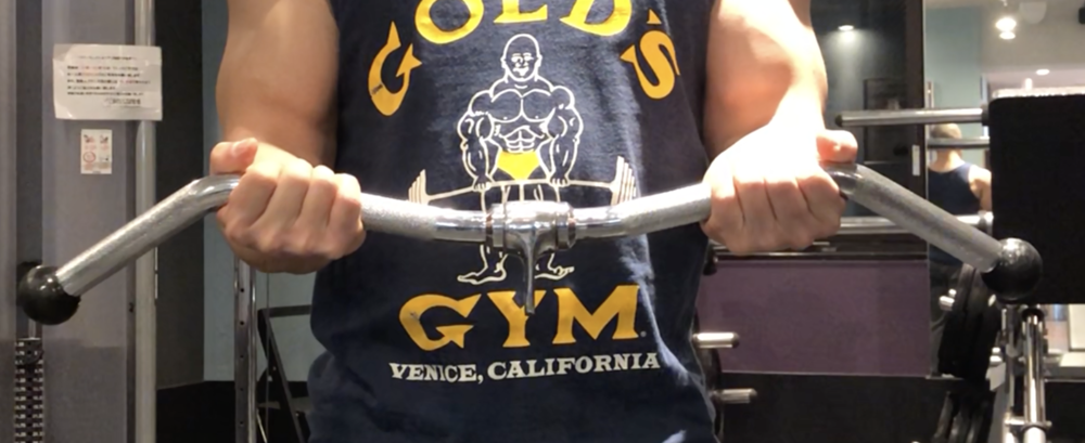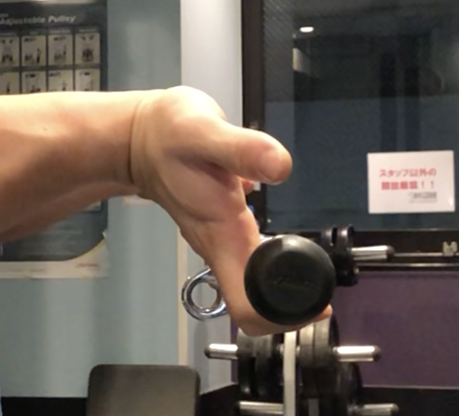 上の画像のように手首が反り返って負けてしまう原因としては、アタッチメントを手の平で握っていることが考えられます。このような状態でトレーニングを続けると、手首を痛めるだけでなく上腕二頭筋も動員しづらくなるので気を付けなければなりません。