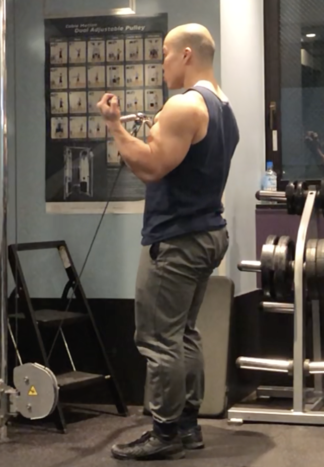 肘が前に出すぎないようにすることも、ケーブルカールのコツのひとつです。上の動画のように肘が前に出すぎたフォームになると、負荷を骨で支えるような状態になってしまいます。そうするとケーブルカールにおいて重要な収縮ポジションでの負荷が弱まるため、肘の動作には注意しなければなりません。