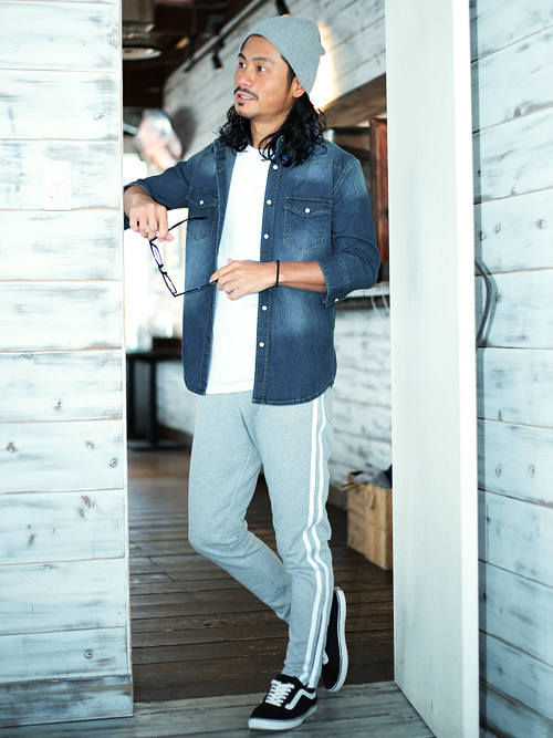 デニム素材の七分丈シャツはジャケット感覚で羽織れるので、七分丈シャツ初心者の方にもおすすめです。ボタンを締めてもOKですが、やはり開けたほうが一段階上のメンズコーデに仕上がります。ストリート系やスポーティー系、カジュアルコーデにもマッチする万能アイテムです。