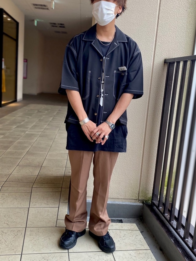全体的にシックなアイテムでまとめているファッションコーデです。堅すぎない印象を与えるために、シャツをあえてパンツから出し、足下にはスニーカーを取り入れています。