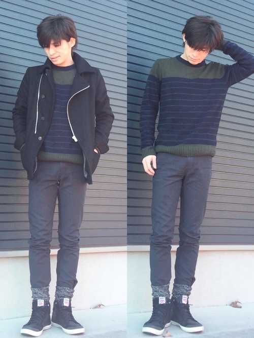 タウンユースはもちろんレジャーシーンでも活躍しそうなメンズコーデです。靴はおしゃれに見えるハイカットをセレクト。ルーズなソックスを合わせることでボリュームを出し、靴に視線を集めます。ジャケットを脱いでもダークトーンのコーデとして完成しています。