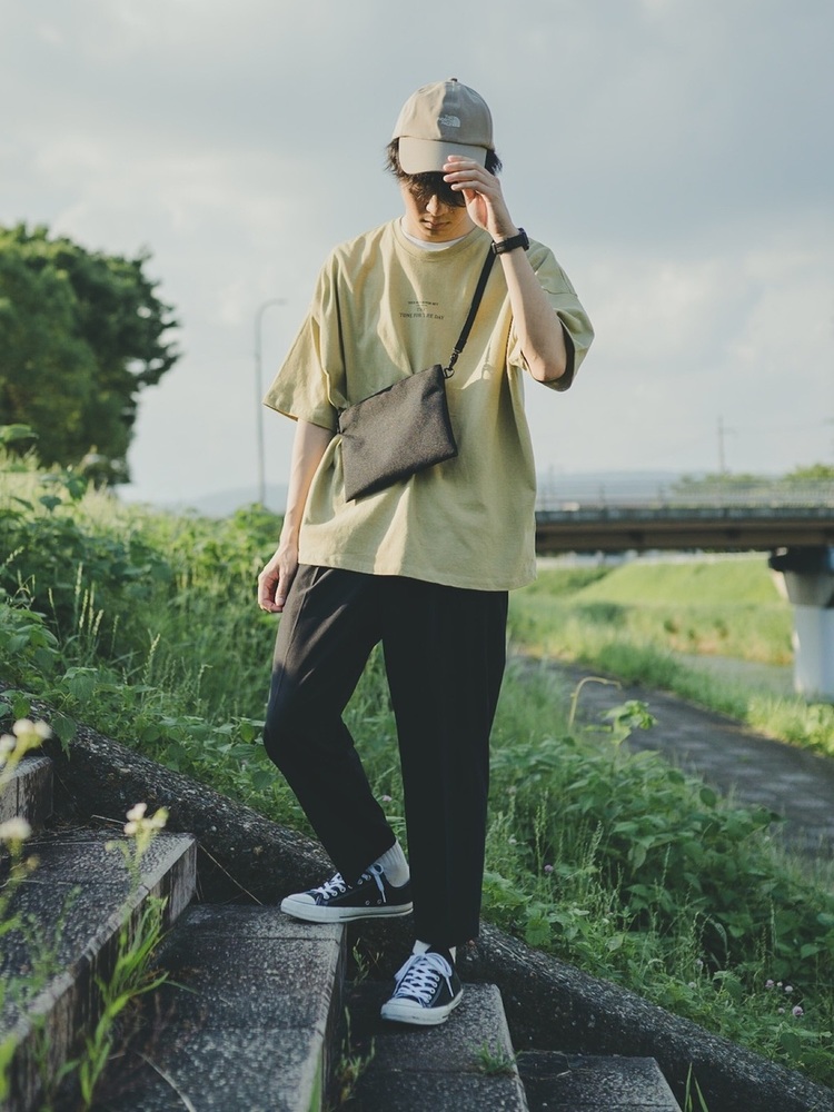 サコッシュ×Tシャツ×ワイドパンツ×キャップ