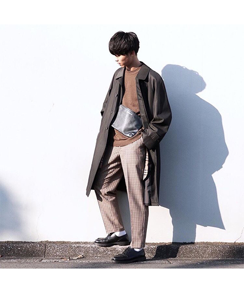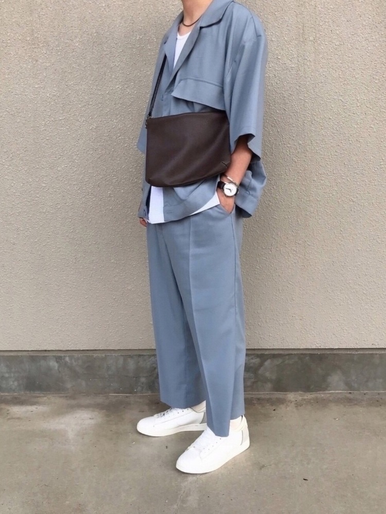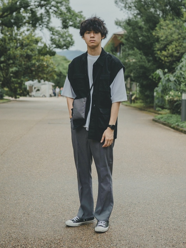 サファリワイドベストとスラックスという難易度の高いメンズコーデでも、シンプルなブラックのサコッシュであれば落ち着いた印象を作れます。全体的にゆったりとしたシルエットには、少し小さめのサコッシュを合わせてコンパクトにまとめましょう。前掛けにしたサコッシュの位置も絶妙ですね。