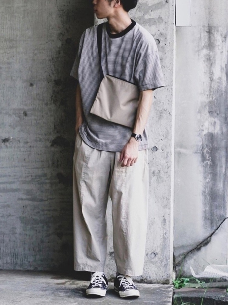 ワイドパンツにポーターのサコッシュを合わせた大人のリラックスコーデ。きめすぎない雰囲気と、マイルドな色使いがこなれ感を演出しています。サコッシュのベルトとTシャツの襟元、スニーカーのブラックが効果的にコーデを引き締めています。