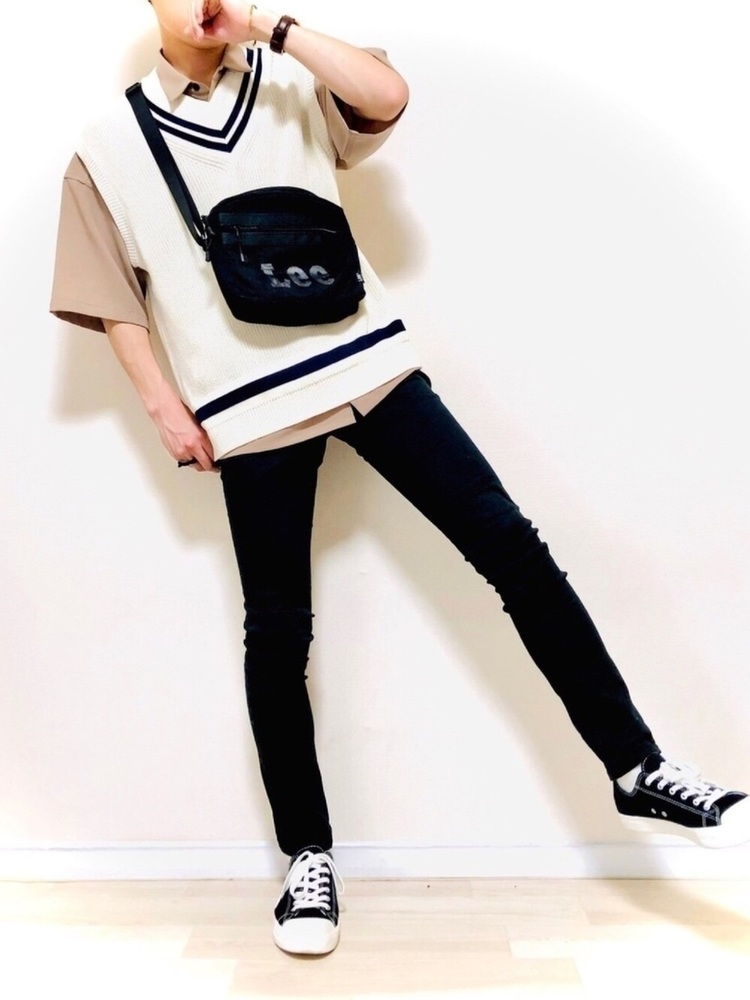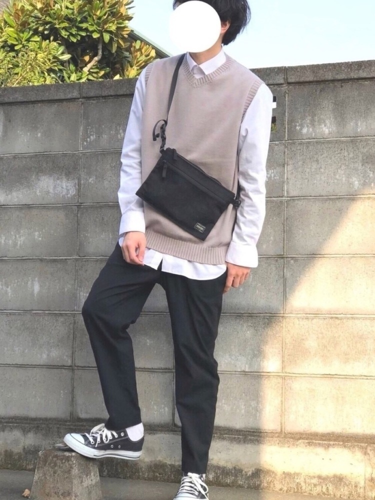 フォーマルになりがちなニットベストとシャツの重ね着でも、ハズしアイテムとしてサコッシュを合わせれば、程よくカジュアルでおしゃれなメンズコーデに。スニーカーでカジュアルダウンすることで、よりこなれ感のあるファッションになります。