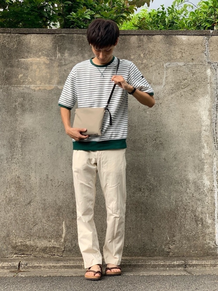 一見するとシンプルなコーデですが、とてもよく計算されたメンズコーデです。重ね着してチラ見せしている白のタンクトップや白のソックスとベージュのシューズでアクセントを付け、前掛けしたGUのサコッシュでブラックをポイント的に足しています。まとまりのあるさりげない大人メンズのおしゃれ感が伝わってきます。