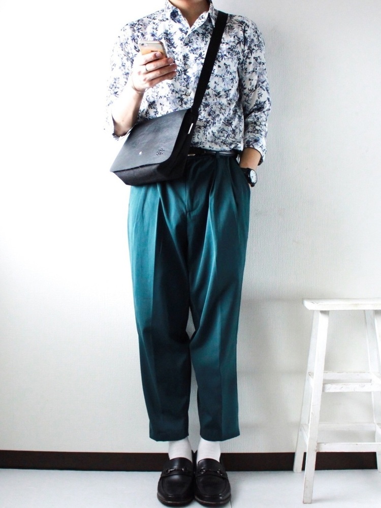 レザーサコッシュ×柄シャツ×カラーパンツ