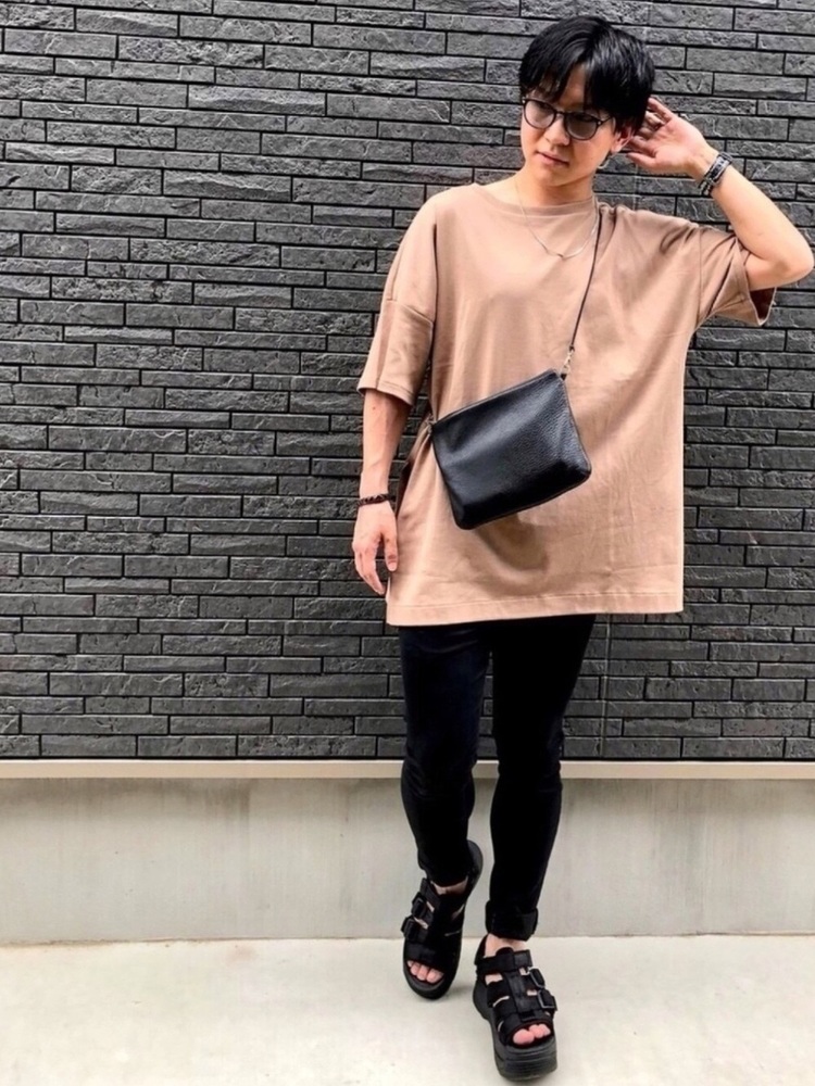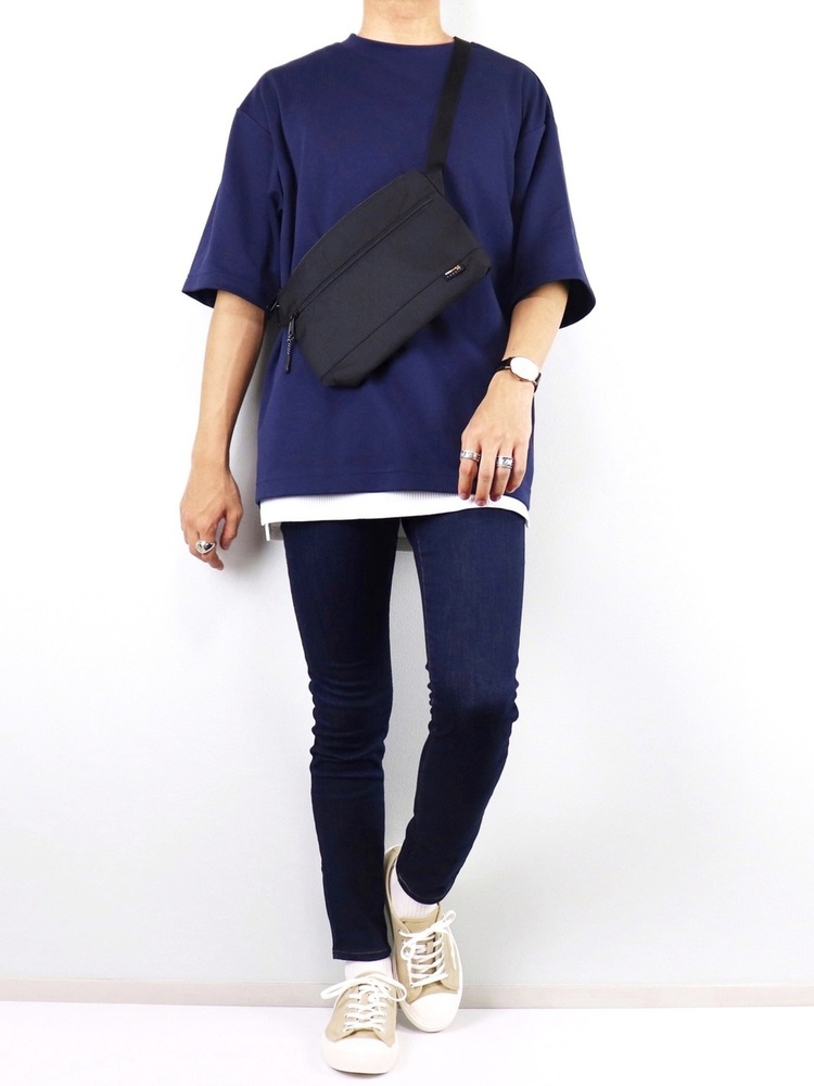 オーバーサイズTシャツにスキニーパンツというシンプルなスタイルに、小物を上手にプラスしたコーデ。細めのベルトのブラックレザーのサコッシュを合わせれば、まるでアクセサリーのようにさりげなく全体を引き立てるアイテムになります。