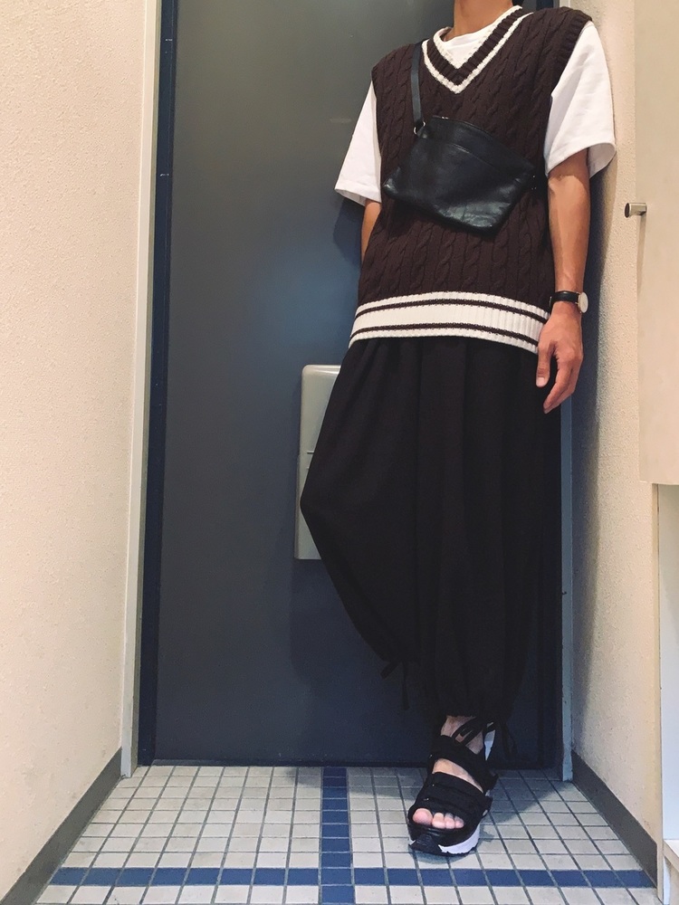 ニットベストにバルーンパンツという、ゆったりとしたシルエットに、コンパクトなブラックレザーサコッシュを合わせて上手くバランスをとったコーデ。絶妙なベルト調節で、全体のシルエットの邪魔をせずに、レザーの高級感をうまくプラスしています。