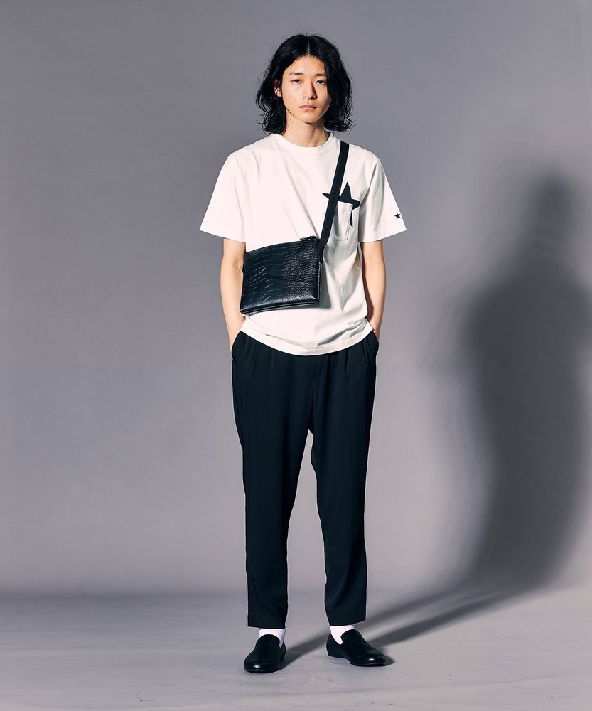サマーニットにサコッシュを合わせれば、カジュアルさと品のよさを両立した大人のメンズコーデに。前掛けしたサコッシュと、パンツやシューズの色をブラックで統一し、都会的な着こなしになっています。
