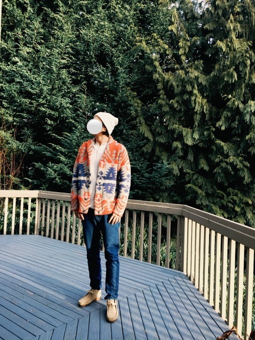 珍しい模様のカーディガンがアクセントになった、優しい雰囲気のカジュアルコーデです。カーディガンと濃いめのデニムに、ワラビーブーツのベージュが相性抜群です。程よいラフさがあり、オシャレ度が高く秋から冬にかけて真似したいコーディネートですね。ワラビーブーツは履き心地が良いので、たくさん歩くお出掛けシーズンにも重宝します。
