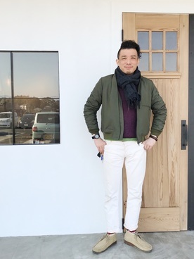 定番のMA-1×ブラウンインナーに白のパンツとベージュのワラビーブーツを合わせると、清潔感のあるきれいめカジュアルコーデになりますね。薄いベージュのワラビーブーツは、写真のような綺麗めなコーデにもカジュアルコーデにも相性抜群なのでヘビーローテーションできます。シンプルな形のおかけで、スッキリとした足元になりコーデが引き立ちます。