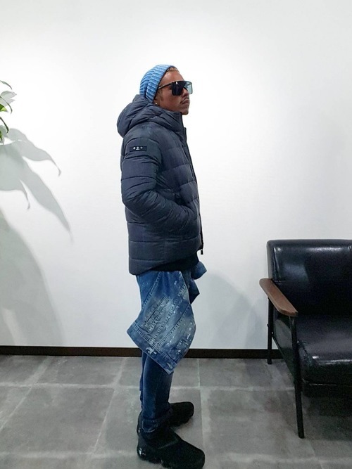 漆黒で完成された着こなしがまさにメンズスタイルの極みと言えるスタイリング。少しマットな光沢のあるダウンジャケットはダメージ加工のほどこされたデニムとベストマッチしています。さらに冷え込む日にはノーカラーの漆黒コートを合わせると抜群の仕上がりになりそうです。