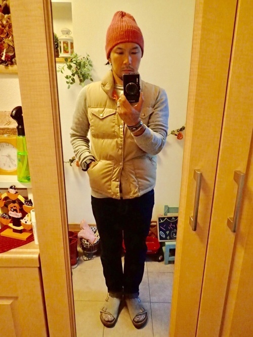 トップスはスウェット、ボトムスはデニムのシンプルなコーデにダウンベストをコーデしています。カッチリしすぎないカジュアルさがあるのはサンダルのおかげですね。スッキリとしたシルエットながらもキメすぎることなく着こなしています。また、ベストはアウターとしての機能性が不足しがちですが、アウトドアブランドなら機能性の心配はほとんどありません。
