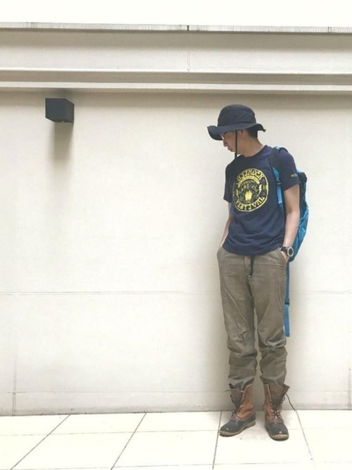 サファリハットをベースにしたハットにトレッキングブーツを合わせたレインコーデです。ブラック系のカラーのハットは街との親和性も十分高く使いやすいアイテムです。アウトドアブランドコーデなのに街でも違和感を感じないのは親和性の高いカラーのアイテムを着こなしているおかげともいえるでしょう。