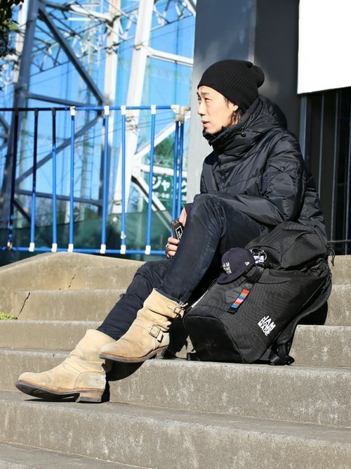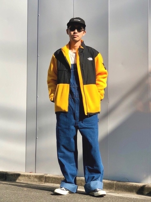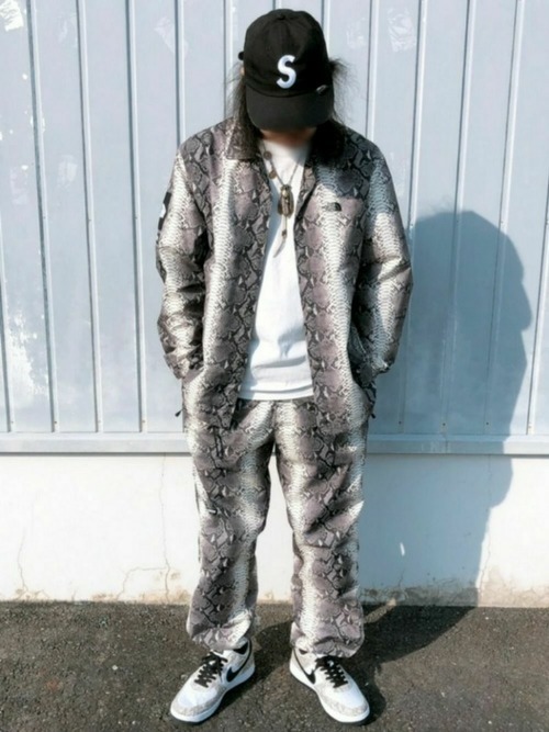 ノースフェイス×Supremeのセットアップです。セットアップは1歩間違えるとダサいと言われてしまいますが、こちらのコーデがそうさせていないのはカラーを統一しているからこそでしょう。トップスやスニーカー、キャップを同色にコーデすることで全体に統一感が生まれ、個性的かつカジュアルなコーデになっています。
