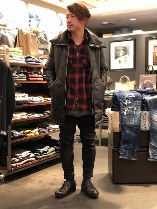 ダウンベストとワイドめのデニムを合わせたアメリカンワークアウトスタイル。ダウンベストとワイドデニムの組み合わせは一見作業服のように見えてしまいそうですが、ネルシャツを合わせることで一気にタウンユースに。同系色でまとめているのも統一感が出ます。