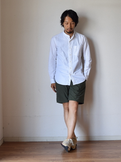ホワイト系バンドカラーシャツ×ショーツ