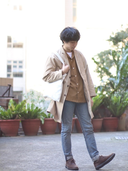チェスターコートとティンバーランドのスニーカーとの組み合わせです。秋のように肌寒くなってくるとダークブラウンのような重厚感のある色が似合うようになります。全体的におちついた雰囲気のあるメンズコーデは大人っぽい印象を受けます。