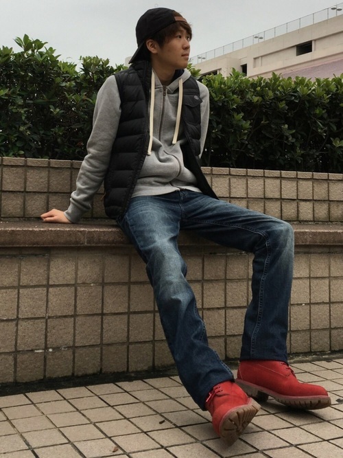 ダウンベストと赤いティンバーランドのメンズコーデです。寒い季節は暖色系のアイテムを入れることで暗めの服を使っていてもコーデを引き立たせてくれます。また、赤色のシックスインチブーツは青系統のデニムと追証がいいので、デニム系を持っている方は真似してみるのもいいでしょう。