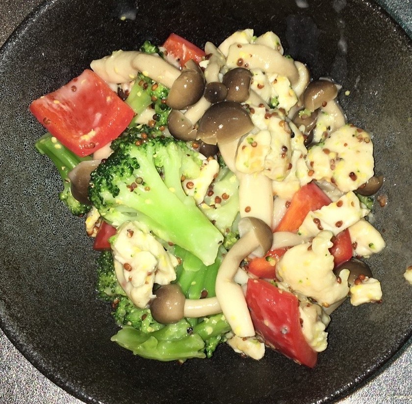 筋肉をつける食品の代表格でもある鶏肉のササミとブロッコリーを使ったメニューです。鶏肉は脂質が少なくタンパク質が豊富なので筋トレをして筋肉をつけるには理想的です。またブロッコリーとしめじで食物繊維やミネラルも補給できバランスの非常に良いメニューです。粒マスタードの風味が病みつきになります。