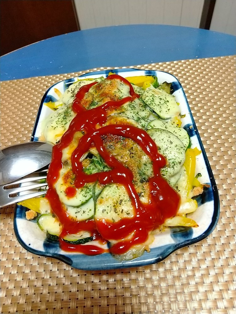 野菜とチーズとサバ缶と非常に栄養のバランスが摂れたメニュー。筋トレをして体を作っているけど、ささみは飽きた。でもタンパク質はしっかり摂りたい。そんなときにオススメのメニューです。ズッキーニがなければナスなどの夏野菜を使っても良いでしょう。
