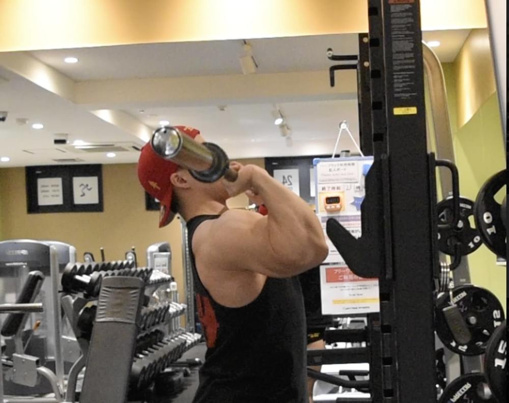 最後にバーベルを挙げていきます。この際、肘を伸ばしすぎず負荷が乗った状態で止めましょう。