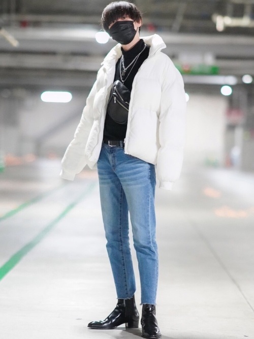 トップスやボトムスはシンプルなアイテムを選んでいて、ホワイトのダウンジャケットとブーツのおかげでユニークかつハイファッションなコーディネートが完成しています。このように、ユニークなアイテムはおしゃれなコーディネートの秘訣です。