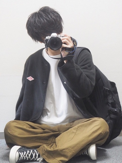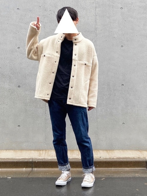 こちらのメンズコーデは、ベースカラーをダークなカラーにしています。しかし、アクセントカラーとしてホワイトのフリースジャケットを着用することによって、コーディネートに明るさが足されているのがポイントです。
