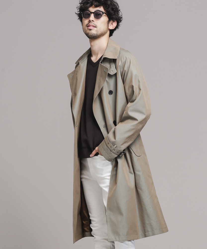 ビジネス系スタイルの着こなしを一気におしゃれにしてくれるナノユニバースのトレンチコート。光が当たらない曇りの日でも光沢感があり、高級ブランドのトレンチコートに見えるのがポイントです。