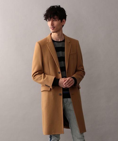 ウエストラインを高めに設置しており、裾に向かって緩やかに広がっているAラインのシルエットのラブレスのチェスターコート。素材はメルトンを使用しており、光沢感のあり高級感のあるコートです。