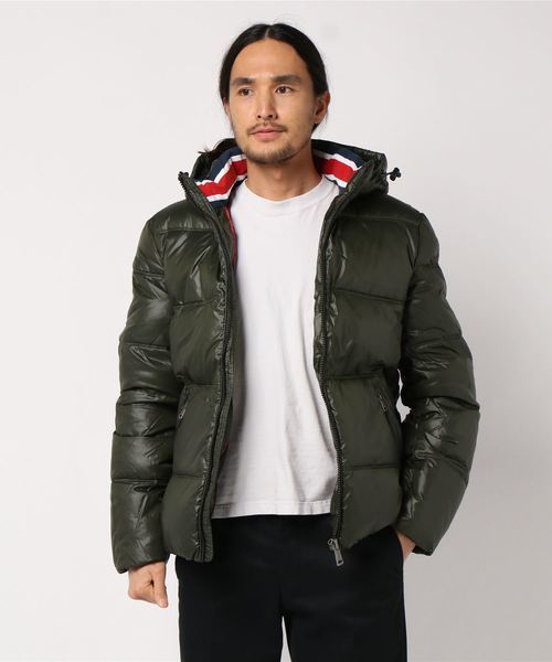 軽くて暖かい着心地がすてきなGUESSのダウンジャケット。キャンプやハイキングなどに大活躍するため、アウトドア系スタイルには欠かせないアイテムです。