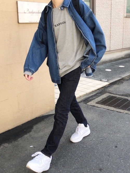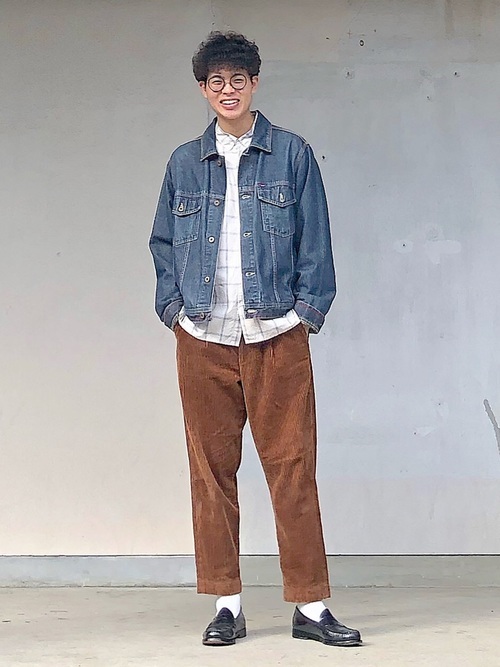 シンプルなアメカジスタイル定番の着こなし。アウターとボトムスはカジュアルなアイテムを着用し、ドレスシューズを履くことで少しドレスアップした印象を与えてくれています。また、デニムジャケットの寒色のブルーとボトムスの暖色のブラウンがきれいに合っていてとてもおしゃれです。