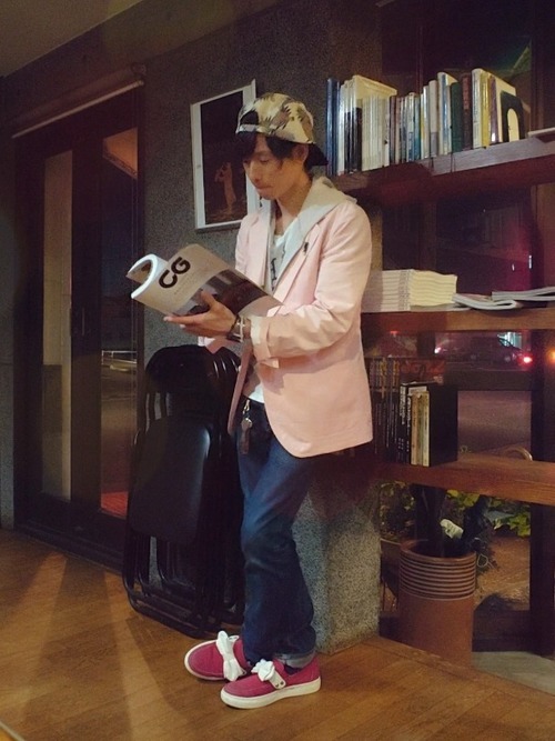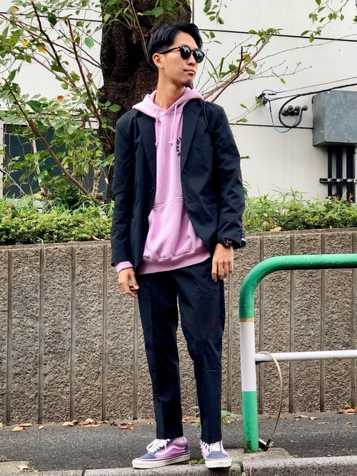ピンクのテーラードジャケットで攻めたおしゃれ男子のカジュアルコーデです。ピンクが似合う男子は女子ウケも抜群なので、積極的に取り入れてみるのもよいでしょう。ピンクが際立つよう、パーカーに無地の白を選んでいるところは、重ね着のポイントをしっかり押さえていると言えますね。