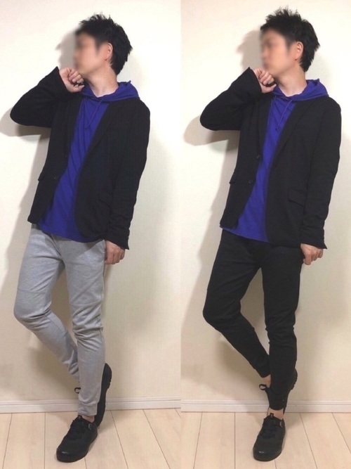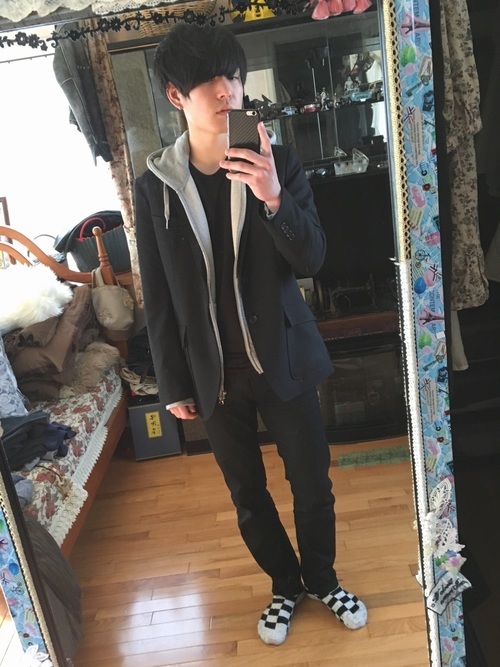 黒テーラードジャケット×グレーパーカーのきれいめコーデ