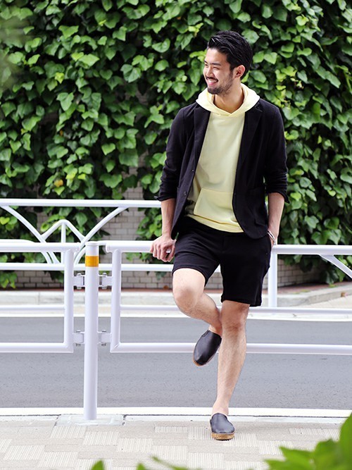 テーラードジャケットとパーカーの重ね着は、残暑の季節には短パンと組み合わせるのがおすすめです。短パンとスリッポンでカジュアルさもプラスした組み合わせとなっています。黒の上下で重めな印象がありますが、中のパーカーに明るいカラーのイエローを選ぶことで、涼しさと爽やかさが感じられますね。