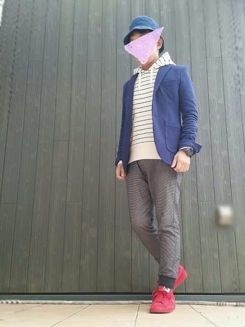 パーカーにボーダーの柄を取り入れたカジュアルコーデです。柄と柄でごちゃごちゃしないよう、テーラードジャケットは無地を選んでいますね。ワンポイントに選んだ赤のスニーカーも目を引く着こなしです。テーラードジャケットは1枚持っているとパーカーとの重ね着だけでなく、いろいろなトップスを使って着回しが効くので便利アイテムとなるでしょう。