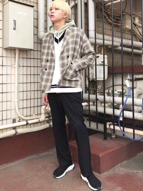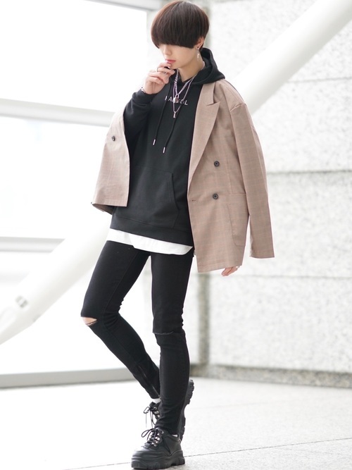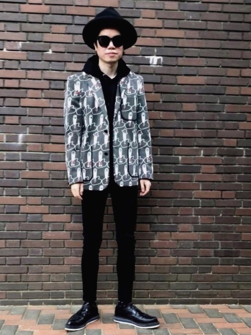 柄ありテーラードジャケット×黒パーカーのファンキーコーデ