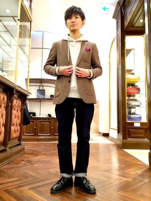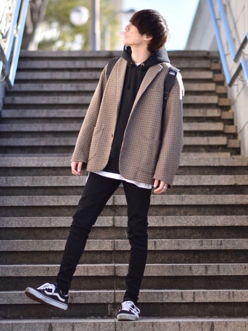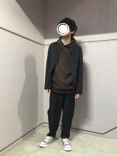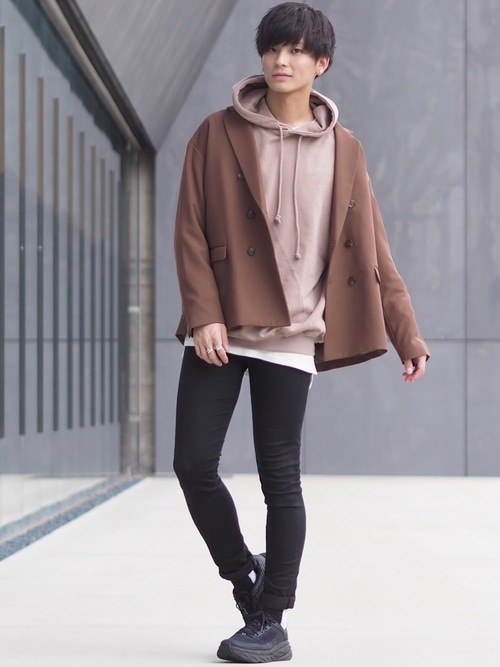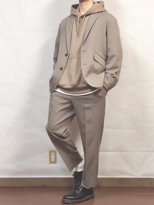ジャケットとパンツをセットアップで揃えたきれいめコーデです。パーカーもブラウン系を選んで統一感のある着こなしになっていますね。またゆとりのあるシルエットになっているので、体型を気にせず着れるのもポイントです。