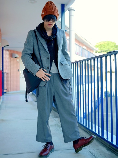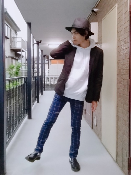 ビッグシルエットのパーカーですが、テーラードジャケットには細身を選んで着太りしないように工夫したスタイルです。上下グレーと黒で暗めな組み合わせですが、シャツに赤チェックを選んでチラ見せさせているところがポイントとなっています。帽子とブーツで決めれば少しアクティブな外出にもぴったりのコーデです。