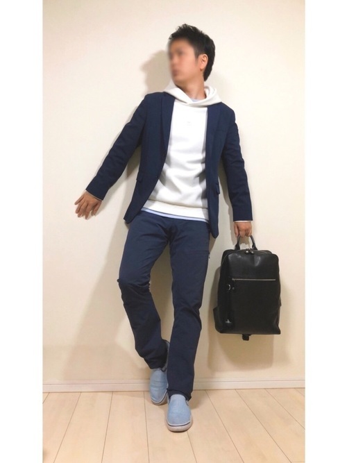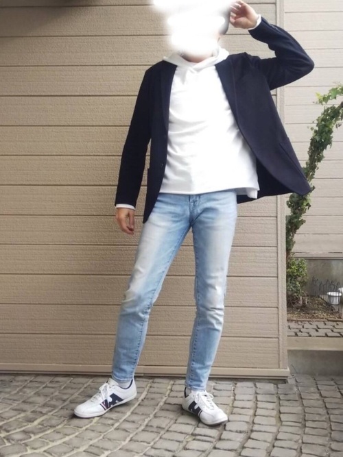 紺テーラードジャケット×白パーカーのカジュアルコーデ