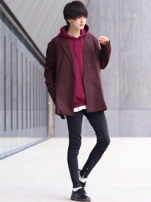 細身のパンツと真逆のオーバーサイズのテーラードジャケットで、きれいめカジュアルにまとめた秋冬コーデです。パーカーにボルドーを選んだあたりも、色の使い方がうまく真似したいポイントとなっています。無地のテーラードジャケットとパーカーの重ね着は他の人と被りやすいので、色選びやアイテムのメリハリなど個性を生かしたコーデで一歩リードしましょう。