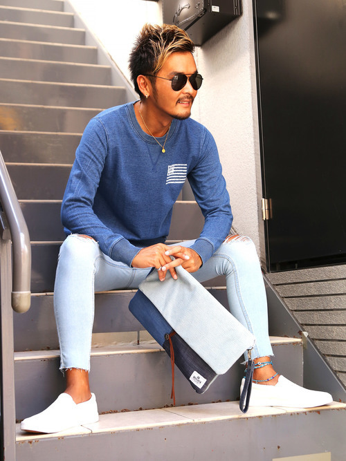 全身をタイトにまとめています。クラッシュデニムを使うなどキマりすぎていない、どこかリラックス感のある着こなしです。西海岸風に見せるためにサングラスを使うのも、おしゃれで良いでしょう。