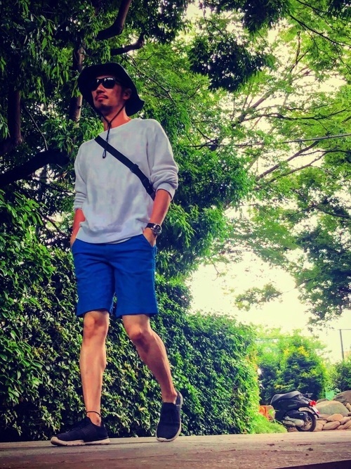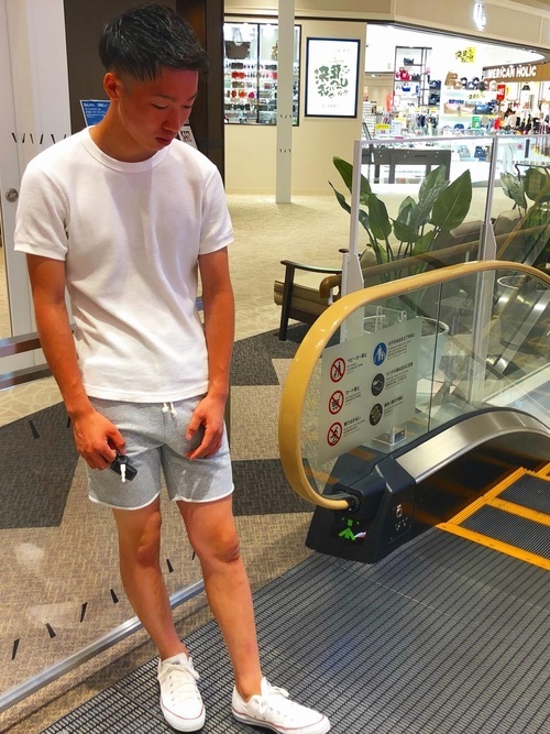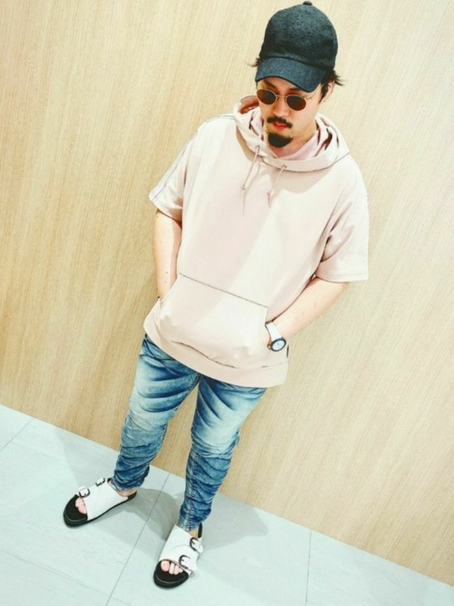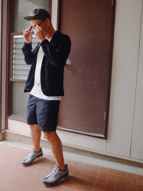 ハーフパンツにサンダルというスタイルです。スポーツブランドのキャップを取り入れつつ、全体のシルエットをタイトにすることで、ラフさを抑えています。