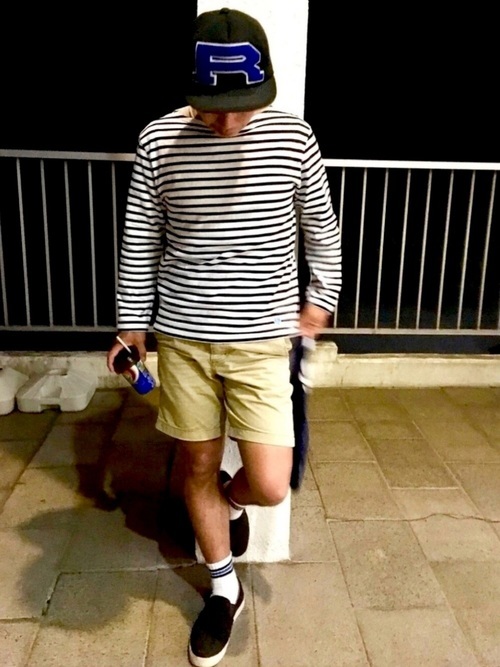 ブラック系キャップ×ボーダーカットソー×ベージュ系ハーフパンツ