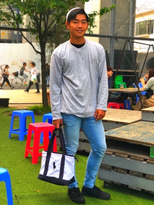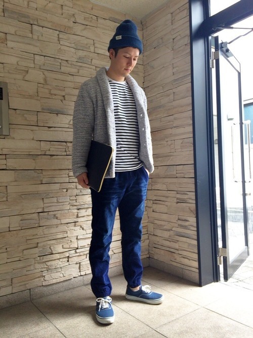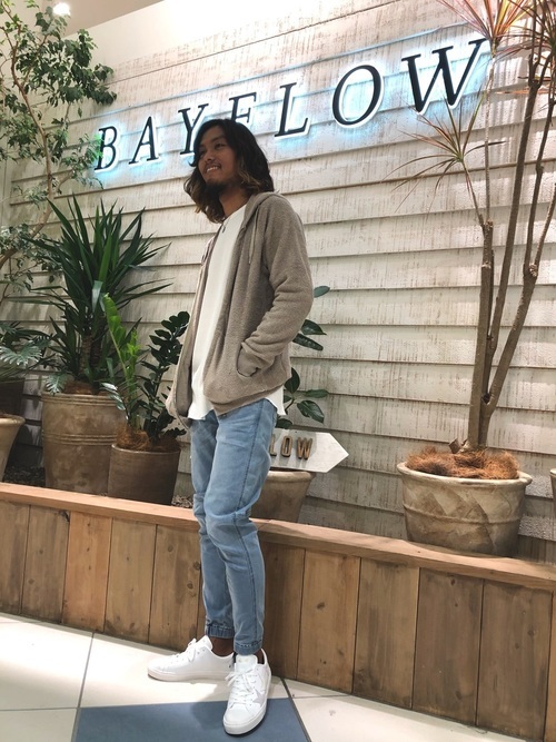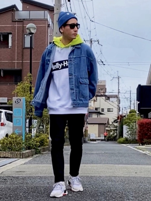ビーニーとデニムジャケットを青で合わせ爽やかさを出しています。またパーカーに蛍光色を入れてカジュアル感を出しています。サイズ感にこだわることでスケーターの様なやんちゃな感じが出ずに落ち着いたリラックス感を演出しています。