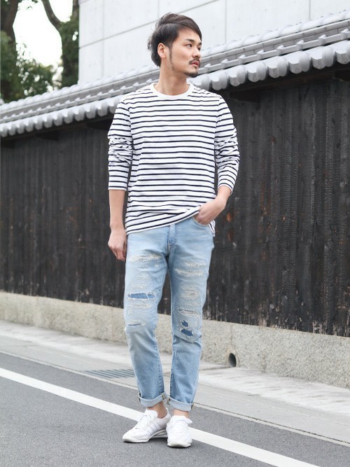 ジーンズをロールアップしてヌケ感を出しているのがこちらのメンズコーデのポイントです。また、白スニーカーを選ぶことで夏らしい爽やかさも演出しています。細いボーダーは西海岸ファッションの定番アイテムで、ジャケットのインナーなど大人っぽい着こなしにも使える汎用性の高いアイテムです。1枚持っておくと着こなしの幅が広がります。