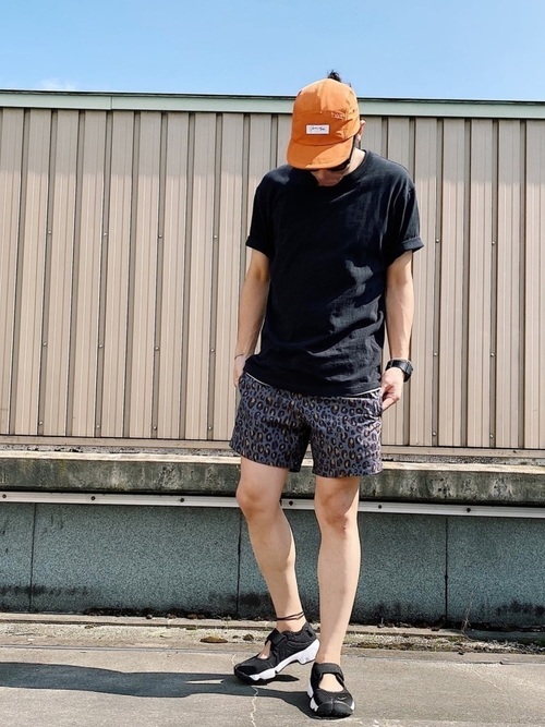 オレンジ系キャップ×ブラック系Tシャツ×柄ハーフパンツ