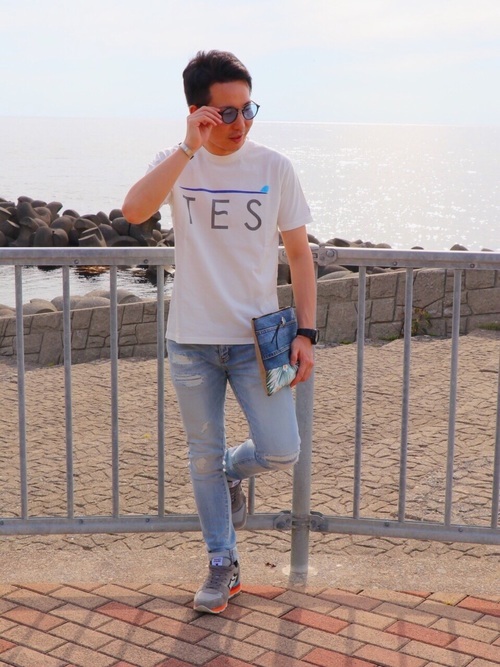 明るい色のジーンズにホワイトのスニーカー、Tシャツの組み合わせは、夏にオススメの爽やかなコーデです。細身のシルエットにすることで、カジュアルなアイテムでもストリート感が出ません。